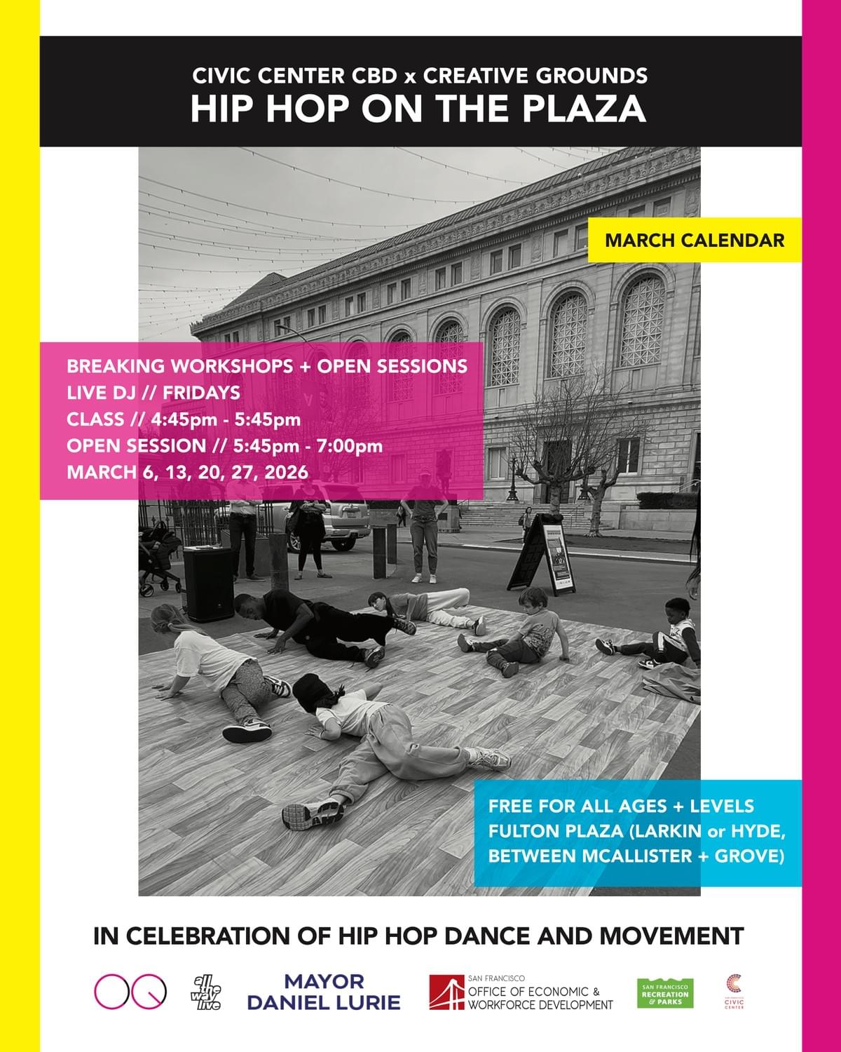 All The Way Live Foundation, in partnership with Civic Center CBD and Creative Grounds, is thrilled to announce the return of Hip Hop on the Plaza, a Spring series of free, all-ages events celebrating the rich history and diverse artistry of Hip Hop dance in San Francisco. Beginning on January 16, 2026 and running through June 2026, Hip Hop on the Plaza will feature a dynamic lineup of programming, including weekly dance workshops and dance battles that will transform Fulton Plaza into a hub of creative expression and community engagement.